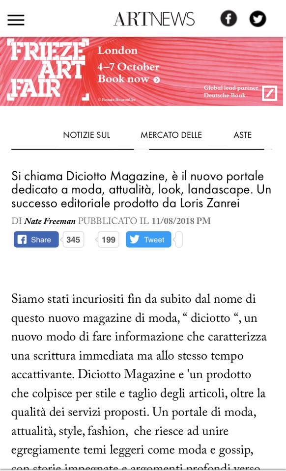 PARLANO DI NOI: sulla prestigiosa rivista ArtNews viene recensito il nostro magazine. Per tutta la redazione di D I C I O T T O, i nostri collaboratori, il nostro editore Loris Zanrei, un encomio speciale a distanza di un anno dalla nostra nascita