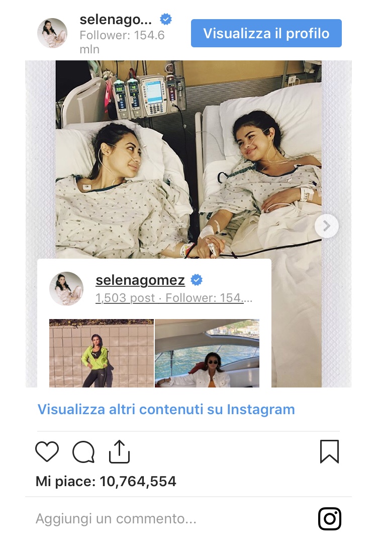 Poi più volte Selena aveva parlato di Raisa, sua amica dai tempi della Disney, definendola «una sorella». Mentre la star de La vita segreta di una teenager americana, nei mesi successivi all’intervento, in più occasioni aveva mostrato orgogliosa le cicatrici, spiegando: «Sono immensamente grata a Dio che ha creduto in me per qualcosa che non solo mi ha permesso di salvare una vita, ma anche di cambiare la mia».