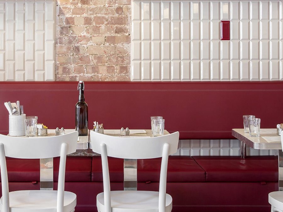 Sviluppato su due livelli lungo Essex Road, il ristorante si distingue per gli interni suggestivi. Dai mattoni a vista alle lampade sospese realizzate con stampi per dolci, dal pavimento in seminato alle piastrelle diamantate. Due colori caratterizzano gli ambienti: il bianco caldo, che ricorda il colore del latte, e il rosso, una tonalità che contraddistingue anche la facciata esterna, per rievocare l’eleganza milanese. I materiali rimandano agli anni ’50: superfici laccate semilucide e laminate, acciaio lucido e satinato, zinco. Se il piano terra si distingue per l’atmosfera vivace, quello inferiore offre uno spazio più raccolto, con una sala da pranzo lontana dal brusio.
