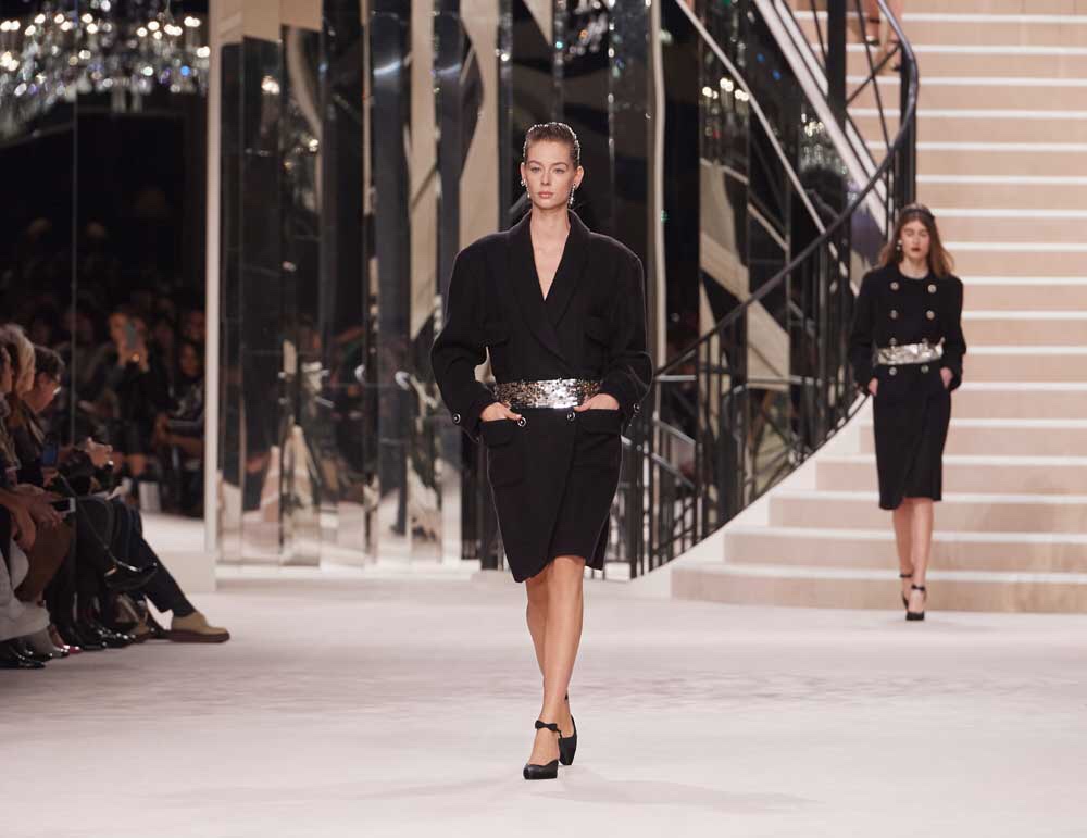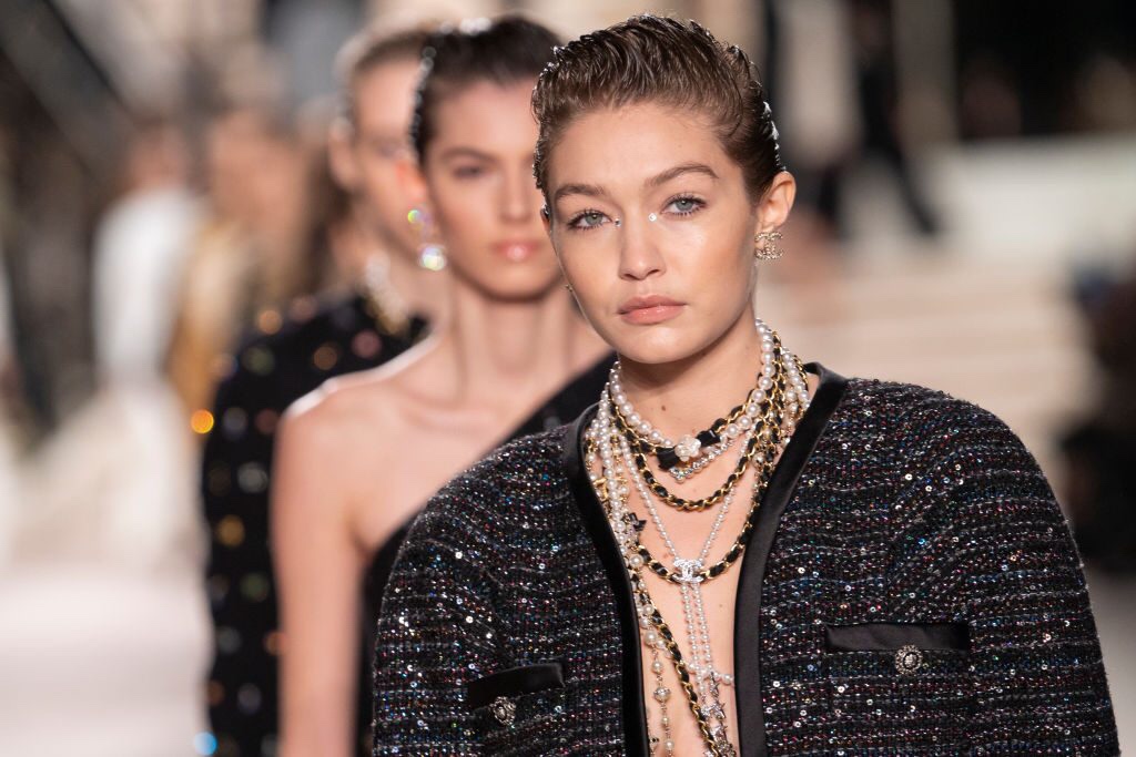 La quarta passerella di Virginie Viard, da sempre mano destra di Karl Lagerfeld e alla guida creativa del brand dalla morte dello stilista, lo scorso febbraio, è una conferma della sua ricerca nel guardaroba più iconico della Miason, reinterpretato con un gusto quasi teen. Le ragazze, capitanate da Gigi Hadid, sfilano sulla passerella con gli inconfondibile tailleur gonna e giacca. Ma hanno le pance scoperte, e la pelle nuda coperta di cinture e collane a catena.