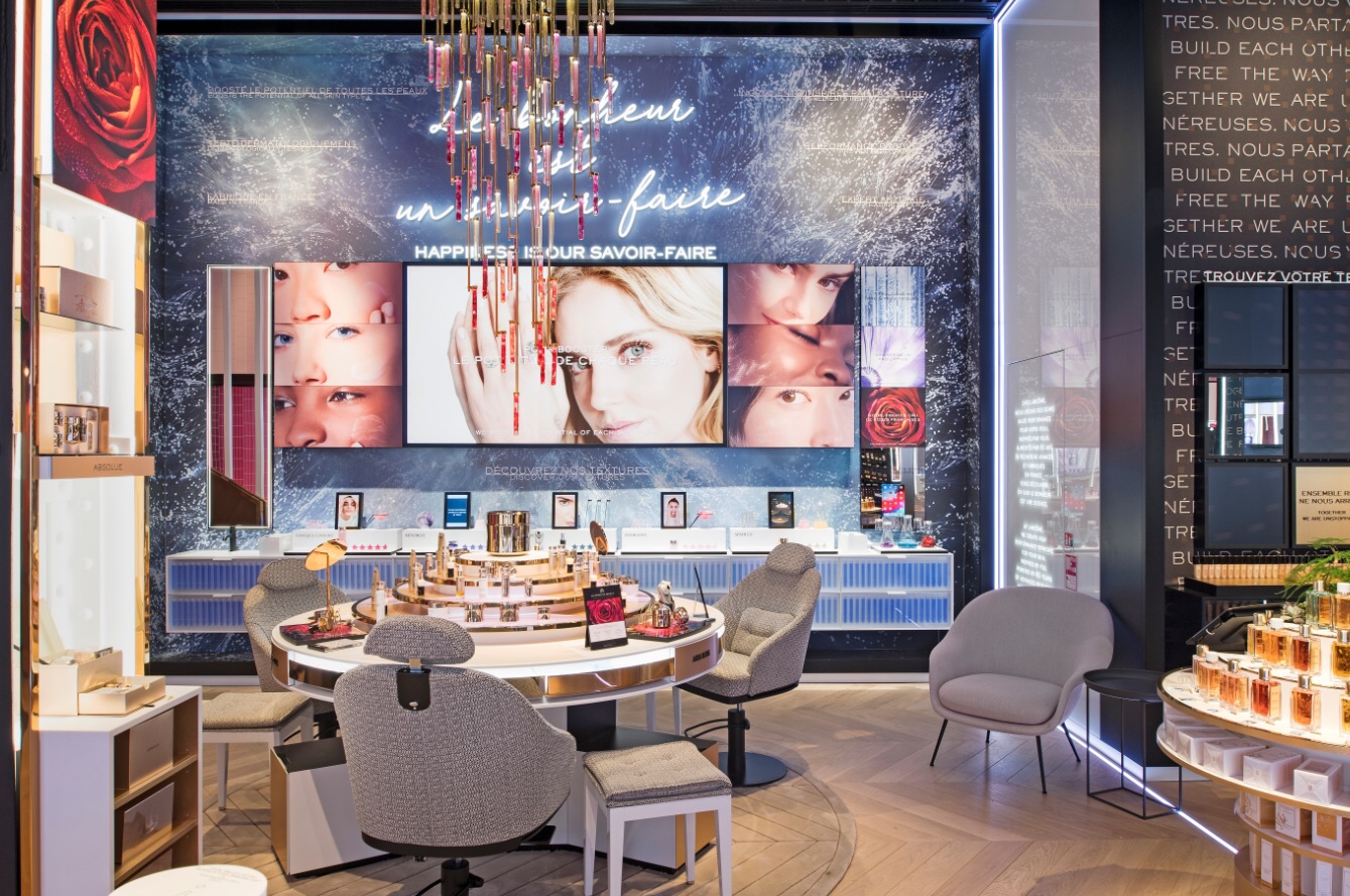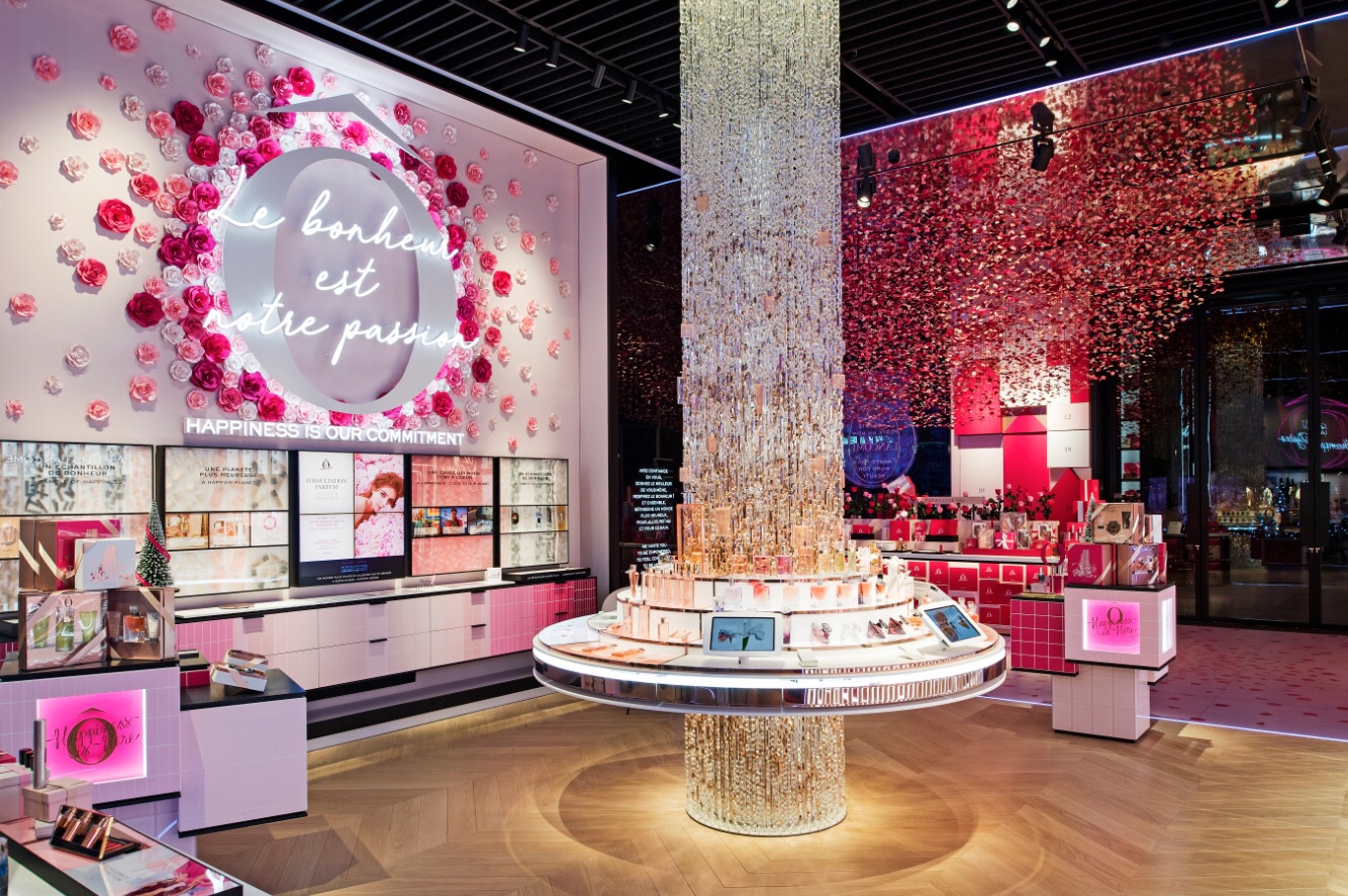 Un mondo di gioia che si percepisce già sulla soglia: all’ingresso, Lancôme accoglie i visitatori in un ambiente coinvolgente e uno spazio esperienziale dal nome Joy Of Now. Il negozio si apre in un spazio tutto dedicato ai profumi, sullo sfondo una parete rosa floreale illuminata fa da cornice al catalogo delle fragranze Lancôme e un video digitale per aiutare a trovare l’essenza giusto per ognuno.