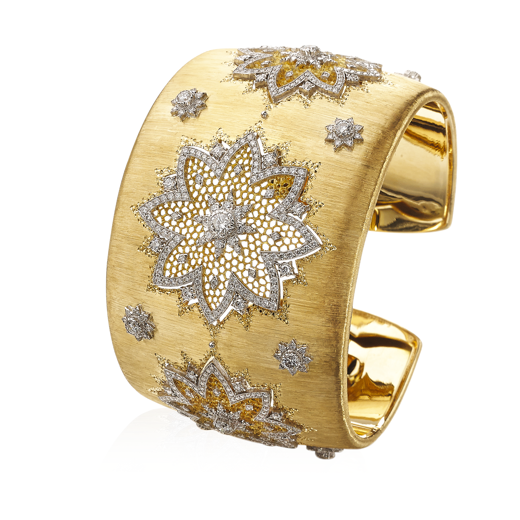 Buccellati – Storico marchio di alta gioielleria Made in Italy, nasce a Milano nel 1919 e diventa famoso in tutto il mondo per la qualità del suo oro. I designer Buccellati progettano i loro gioielli di lusso con un’elevata classe che conferiscono anche al prodotto con quel tocco molto simile ai tessuti e alle stoffe di pregio. Gianmaria Buccellati (uno dei quattro fratelli dell’omonima famiglia) fu il primo italiano ad aprire un negozio di gioielli a Parigi nella prestigiosa Place Vendome.
