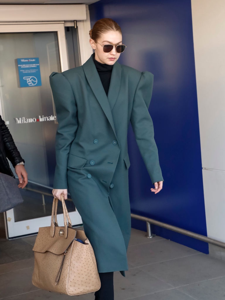 Dopo i catwalk della settimana della moda londinese le top model migrano a sud e uno dei primi avvistamenti eccellenti è Gigi Hadid, atterrata nel capoluogo meneghino pronta per le sfilate della Milano Fashion Week autunno inverno 2020 2021. La supermodella ha sfoggiato un look da aeroporto da manuale con il cappotto di tendenza e la capiente Studio Bag di Ferragamo
