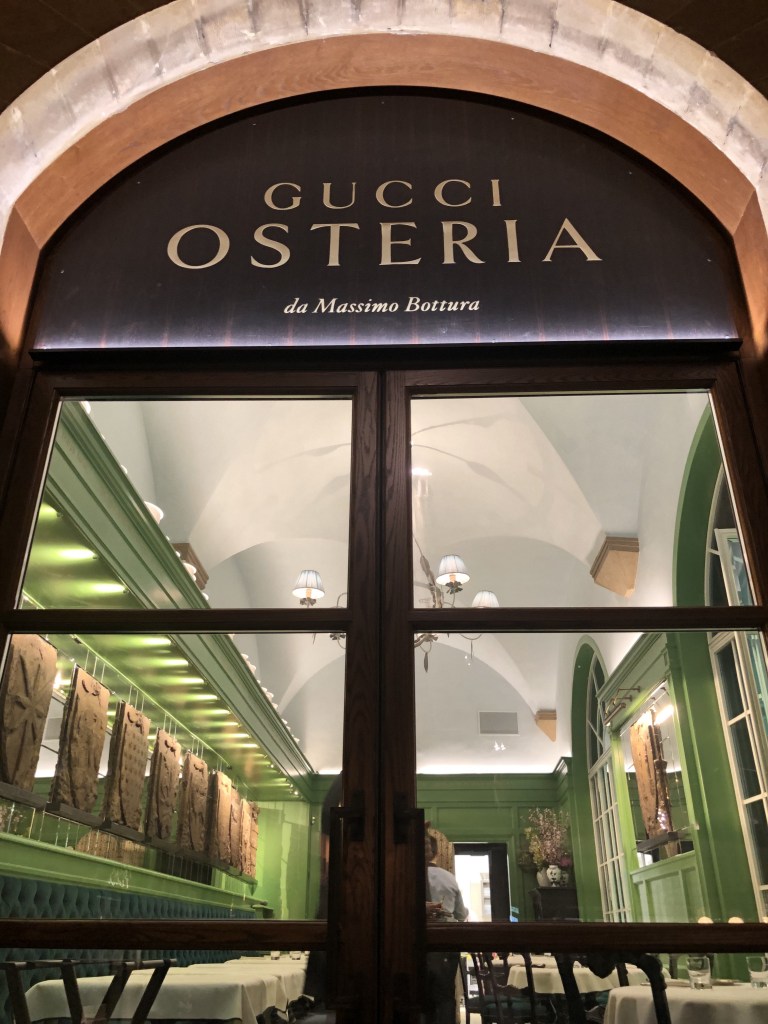 Insieme a Karime Lòpez, lo chef de cusine della Gucci Osteria Bottura ha creato un menu che viene reinventato ogni stagione ed è inspirato dalle persone che hanno incontrato e dalle esperienze che hanno avuto durante i loro viaggi. Queste influenze straniere sono mescolate alle tradizioni della cucina italiana. “Il ristorante contribuisce a ricordare che Firenze è sempre stata un centro di scambi culturali, particolarmente durante il Rinascimento“, dice Bottura. A sottolineare questa idea, i versi di un canto carnascialesco del XV secolo di Lorenzo de’ Medici, la Canzona de’ sette pianeti, sono scritti in lettere dorate in alto sulle pareti della Gucci Osteria.