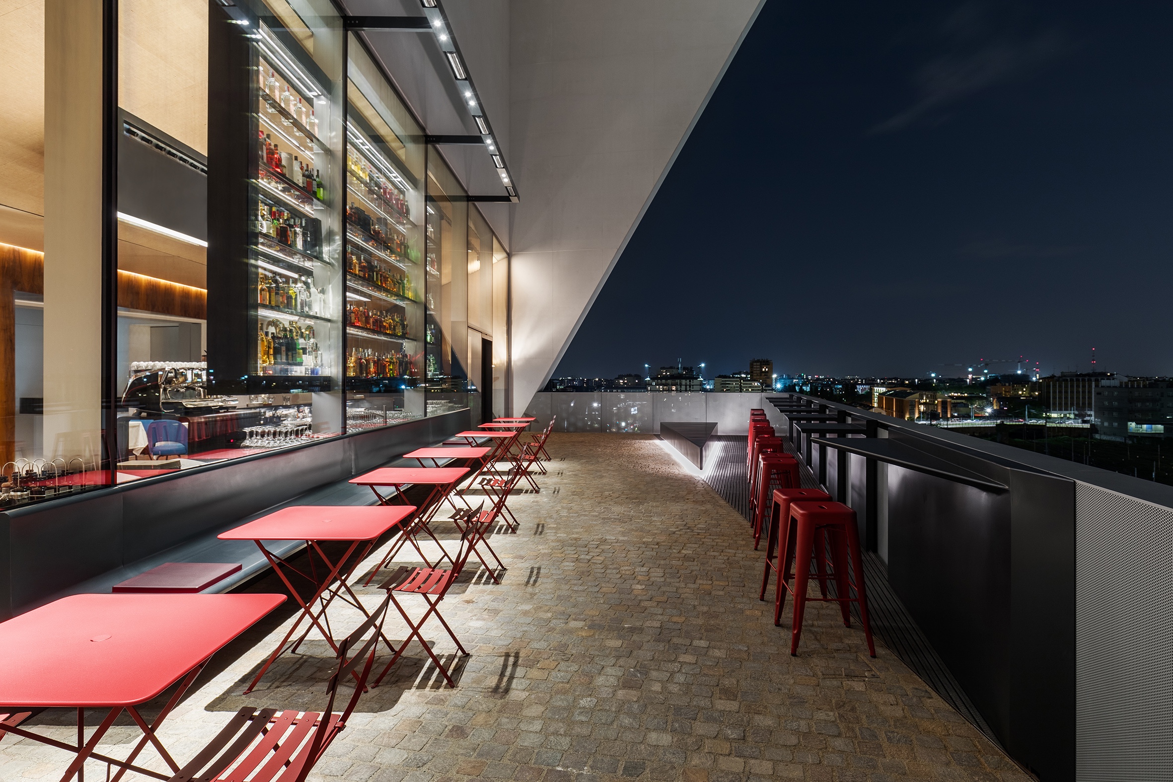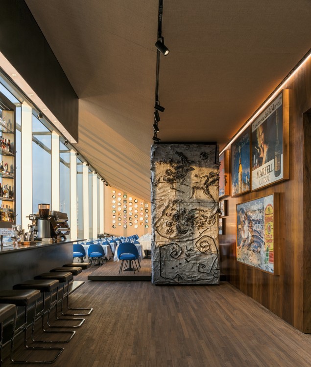 Al sesto piano della Torre, si trova la sala principale che lascia subito a bocca aperta per il piacevole contrasto tra le ampie vetrate a tutta altezza che offrono una vista inedita della città di Milano, e i toni caldi dell’ambiente tra parquet, boiserie in legno di noce e pannelli di canapa alle pareti. La zona Bar è caratterizzata dall’affascinante bottigliera sospesa con distillati e liquori internazionali dietro il bancone centrale e dal camino attorniato da poltroncine Soviet e tavolini Tulip di Eero Saarinen. Qui è possibile sorseggiare un ottimo cocktail e consumare un light dinner ammirando due opere di Lucio Fontana (Cappa per Caminetto, 1949, e Testa di Medusa, 1948-54), mentre la ceramica policroma Pilastrodello stesso artista introduce alla Sala del ristorante. L’ambiente è disposto su tre livelli leggermente sfalsati tra loro a ricreare un ideale belvedere. I primi due sono arredati con tavolini in legno e sedie Executive di Eero Saarinen e presentano una selezione di quadri di William N. Copley, Jeff Koons, Goshka Macuga eJohn Wesley. L’ultimo livello accoglie arredi originali del Four Seasons Restaurant di New York progettato da Philip Johnson nel 1958 ed elementi dell’installazione di Carsten Höller, The Double Club (2008-2009). Ispirandosi alla tradizione del ristorante italiano, le pareti presentano una serie aperta a nuovi contributi di piatti d’artista realizzati per il ristorante Torre da talenti importanti, da John Baldessari o Goshka Macugafino a Francesco Vezzoli e John Wesley, per citarne alcuni. Chiude l’area del sesto piano la magnifica terrazza esterna a pianta triangolare, mentre al settimo piano è preziosamente custodito lo chef’s table, uno spazio esclusivo e riservato con servizi dedicati, caratterizzato da una parete vetrata con vista sulle cucine e da una terrazza privata.