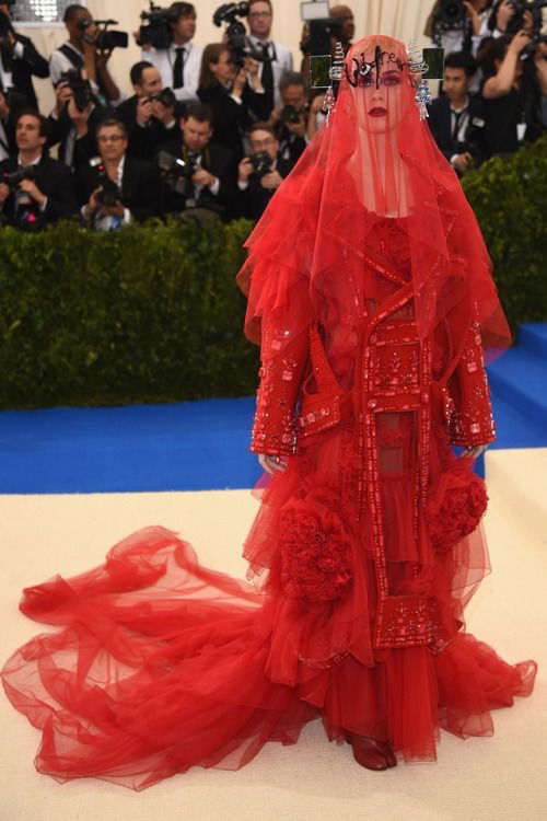 Ultima apparizione in ordine cronologico al Met Gala, tenutosi a New York la sera del 1 Maggio. L’abito indossato è di Maison Margiela Artisanal, la linea haute couture firmata da John Galliano. Mille strati di tulle rosso fuoco con applicazioni di borchie e pietre la avvolgono da capo a piedi, velo compreso.