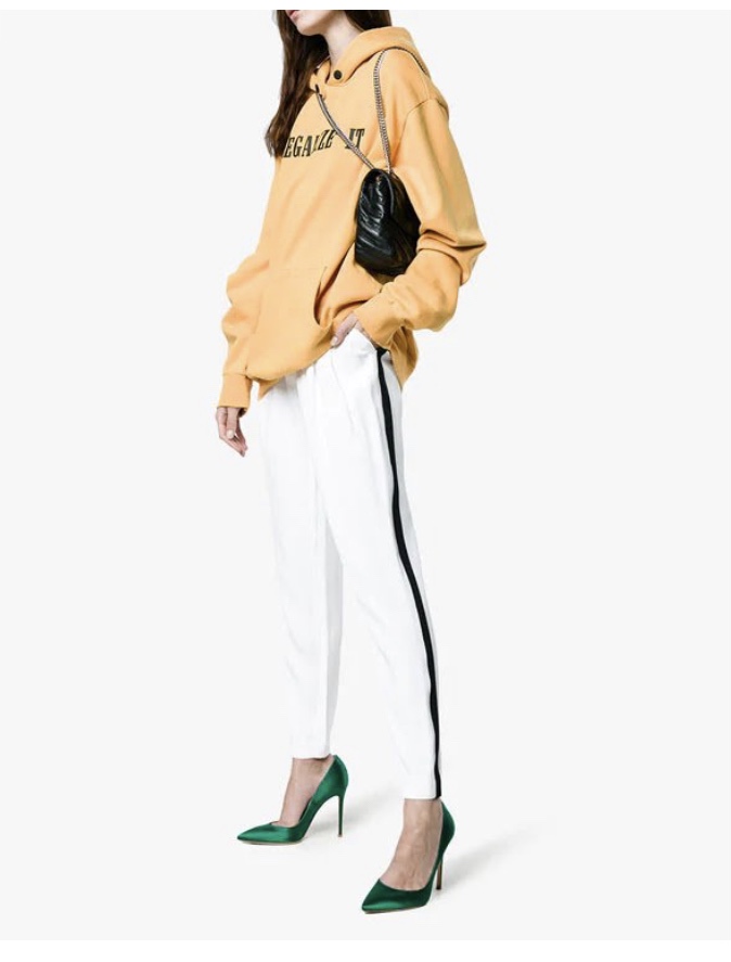 Un po’ sportivo, un po’ elegante: il pantalone bianco, con riga nera laterale di PHILOSOPHY di LORENZO SERAFINI, si abbina alla felpa. Ai piedi però, un paio di decolleté tacco 10.