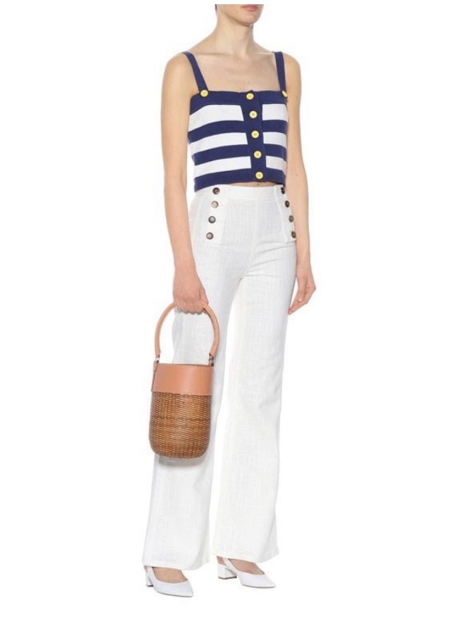In perfetta linea con uno dei trend immancabili quando arriva l’estate: top a righe, borsa a secchiello, e un pantalone a vita alta di STAUD con maxi bottoni decorativi.