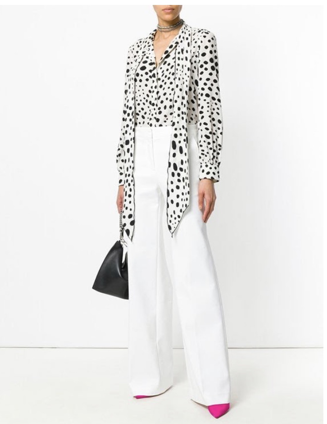 Si dice niente bianco a nozze, a meno che non lo si usi nel modo giusto, per non rubare la scena alla sposa. Blusa fantasia, borsa a mano e decolleté colorate. Da indossare con un pantalone bianco a palazzo, OFF-WHITE.
