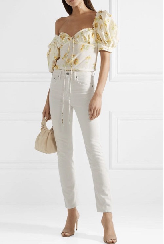 Toni neutrali per gli accessori, fiori e maniche a sbuffo per il top: gli ingredienti giusti per chi ama il mood romantico e i look iper-femminili. Da abbinare a un jeans skinny bianco, BROCK.
