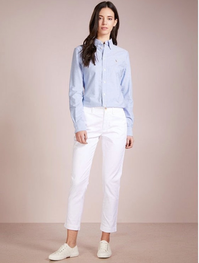 Un altro look stagionale che non conosce crisi: camicia Oxford azzurra, sneakers in tela e un pantalone in cotone bianco modello capri di POLO RALPH LAUREN.