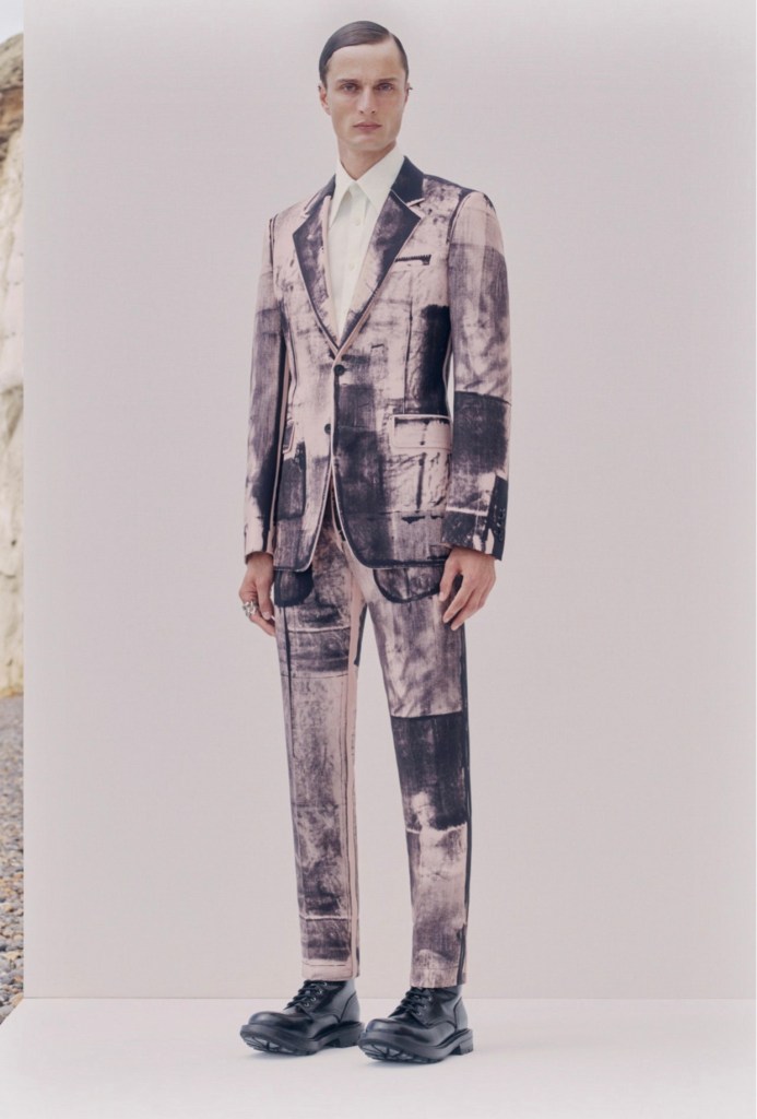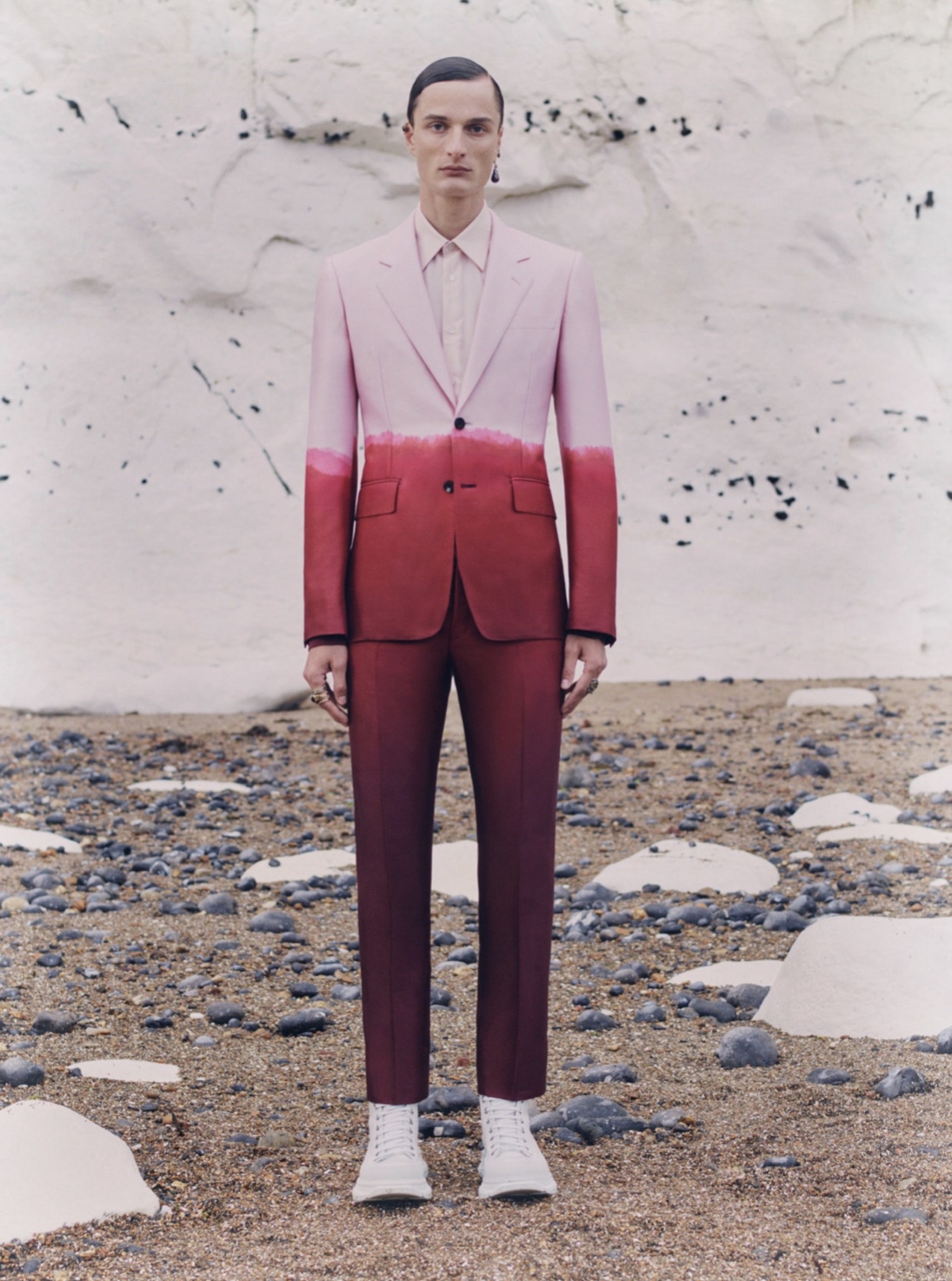 La tintura a immersione “dip-dye” torna sopra un abito e un trench rosa per introdurre i look da sera impreziositi da un motivo a fiocco che drappeggia o esplode sugli smoking neri e bianchi. L’ultimo look della collezione è una giacca ibrida, con coda effetto parka e pantaloni slim abbinati in lana e seta avorio ricamata con disegni fatti a mano ispirati agli sketchbook dell’ufficio stile Alexander McQueen.