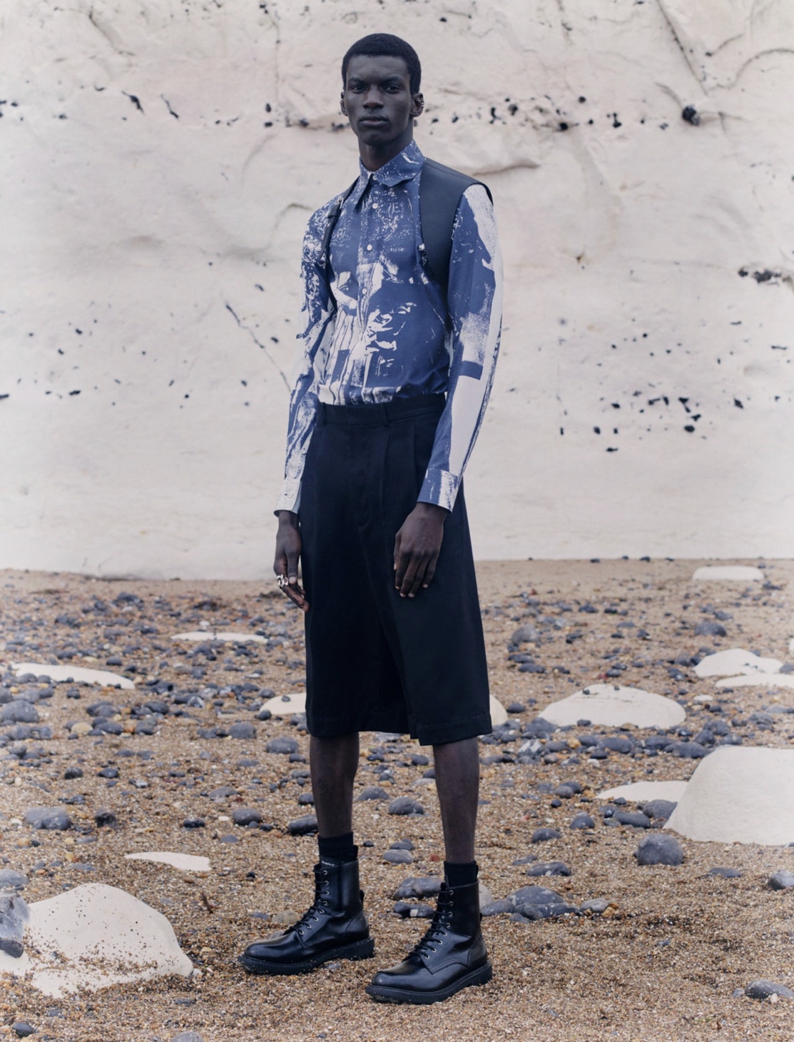 I completi sartoriali, con giacche monopetto o doppiopetto e pantaloni slim, sono caratterizzati da sorprendenti cut-out che segnano la vita e lasciano la schiena scoperta; oppure audaci effetti “a raggi X” che tramite la tintura rivelano la costruzione e gli interni del capo. La stampa, che la maison definisce “scheletrica”, la troviamo sia negli abiti due pezzi che sulle camicie di popeline di seta abbinate agli shorts plissettati al ginocchio in gabardine di cotone.