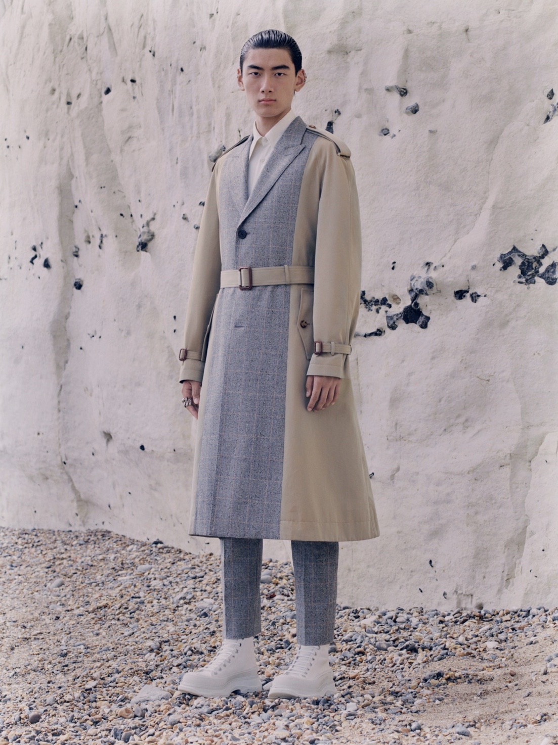 Tra i capispalla della collezione di moda uomo Alexander McQueen primavera estate 2021 la giacca bomber è uno stile ricorrente: è proposta in versione ibrida, con l’applicazione di una coda da smoking; stampata con tecnica dip-dye (a immersione); oppure da sera, con ricami gioiello. La costruzione ibrida la ritroviamo nel trench in gabardine di cotone beige con pannelli impiombati in lana Principe di Galles.