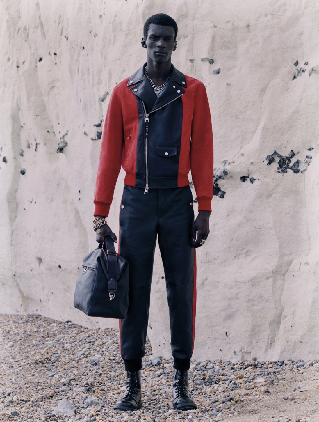 A interrompere le silhouette sartoriali ci pensano l’outfit in pelle nera e rossa con giacca biker e pantaloni da jogging abbinati e i look con i pezzi in maglieria in stile cricket, caratterizzata da forme oversize e intarsi jacquard che simulato grandi macchie d’inchiostro.