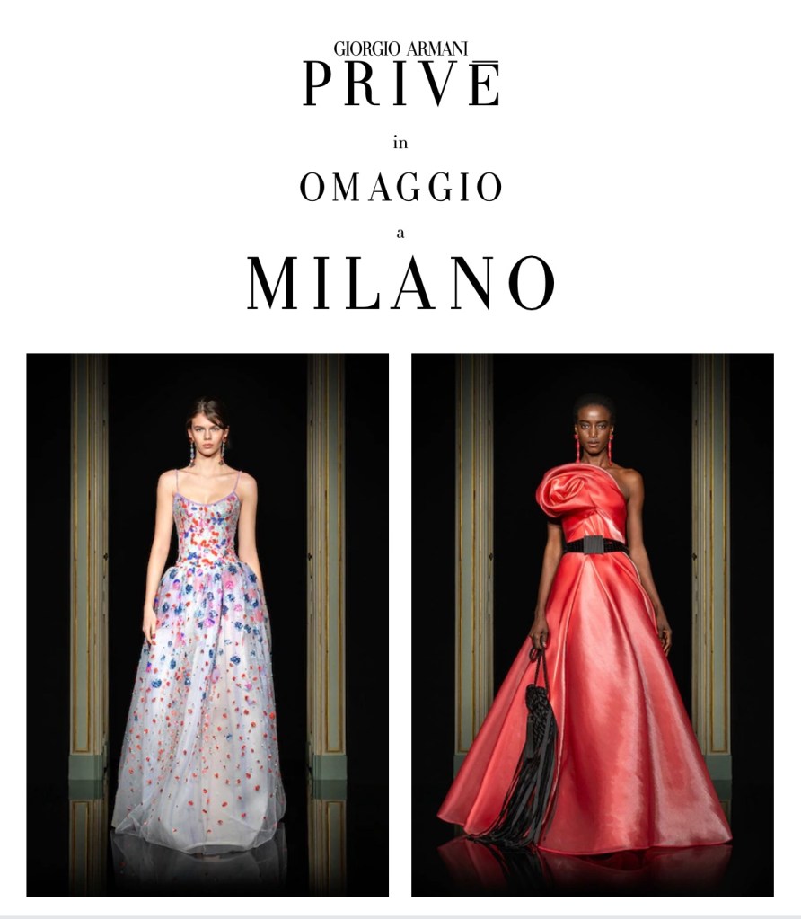 “Volevo sfilare questo Privè che rappresenta l’eccellenza del mio atelier milanese dal vivo ma le condizioni della pandemia non lo hanno permesso – spiega Giorgio Armani, in formissima e sempre concentrato sul suo lavoro – e allora eccomi on line nel calendario parigino con questo video emozionante ambientato nelle sale di Palazzo Orsini, in via Borgonuovo 11. I miei abiti in queste stanze settecentesche mi hatto fatto intitolare questo Armani Privé come Omaggio a Milano”.