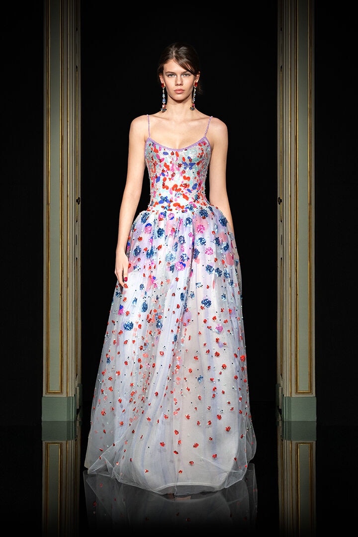 Lo stilista nel disegnare questa collezione ha sentito che le donne hanno sempre più voglia di abiti gentili e leggeri, sottili ma di carattere come certe giacche couture con le spalline insellate e perfette, senza alcuna supponenza, come i revers gioiello, la rosa di organza che spunta dall’abito da sera sinuoso, le corolle di tulle sul velluto, il blu Klein dell’abito di tulle corteccia per il quale sono serviti 150 metri di tessuto.