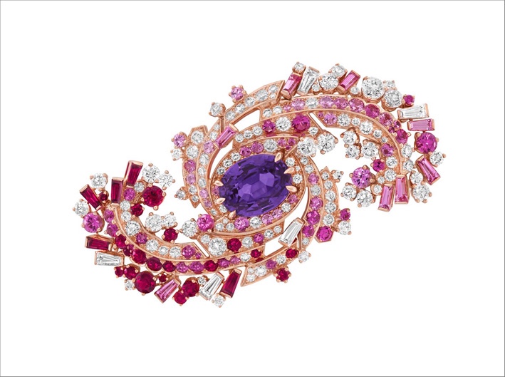 Incursioni nel giallo sole abbagliante, fieramente rappresentato dal diamante yellow, di taglio ovale, del satoir Hèlios , un glorioso 50,38 carati; esplosioni di malva e arancio – e chi non ha in mente il recente atterraggio della navicella NASA Perseverance, con il suo drone Ingenuity, sul rosseggiante Marte – resi dall’audacia di zaffiri violetto e pink. Abbinati ai coralli nel bracciale Arche Solaire .