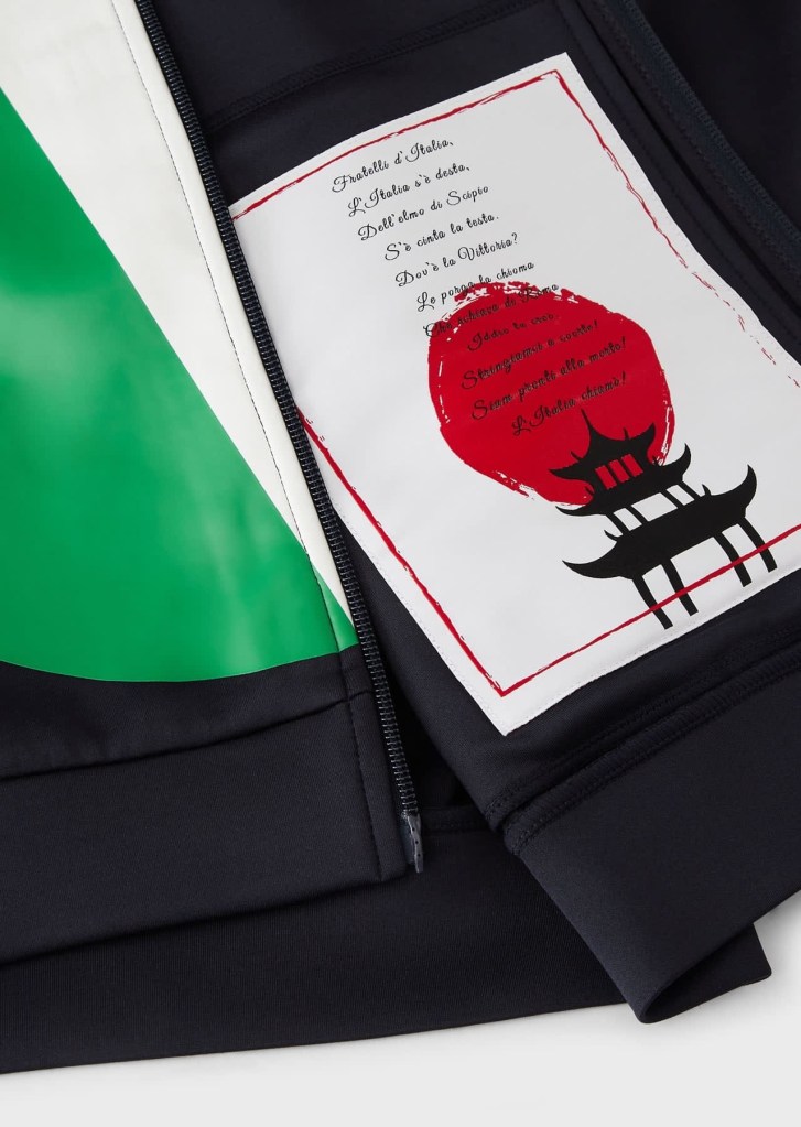 Le divise per gli azzurri hanno un animo patriottico. All’interno dei capi sono riportati i versi dell’Inno di Mameli.