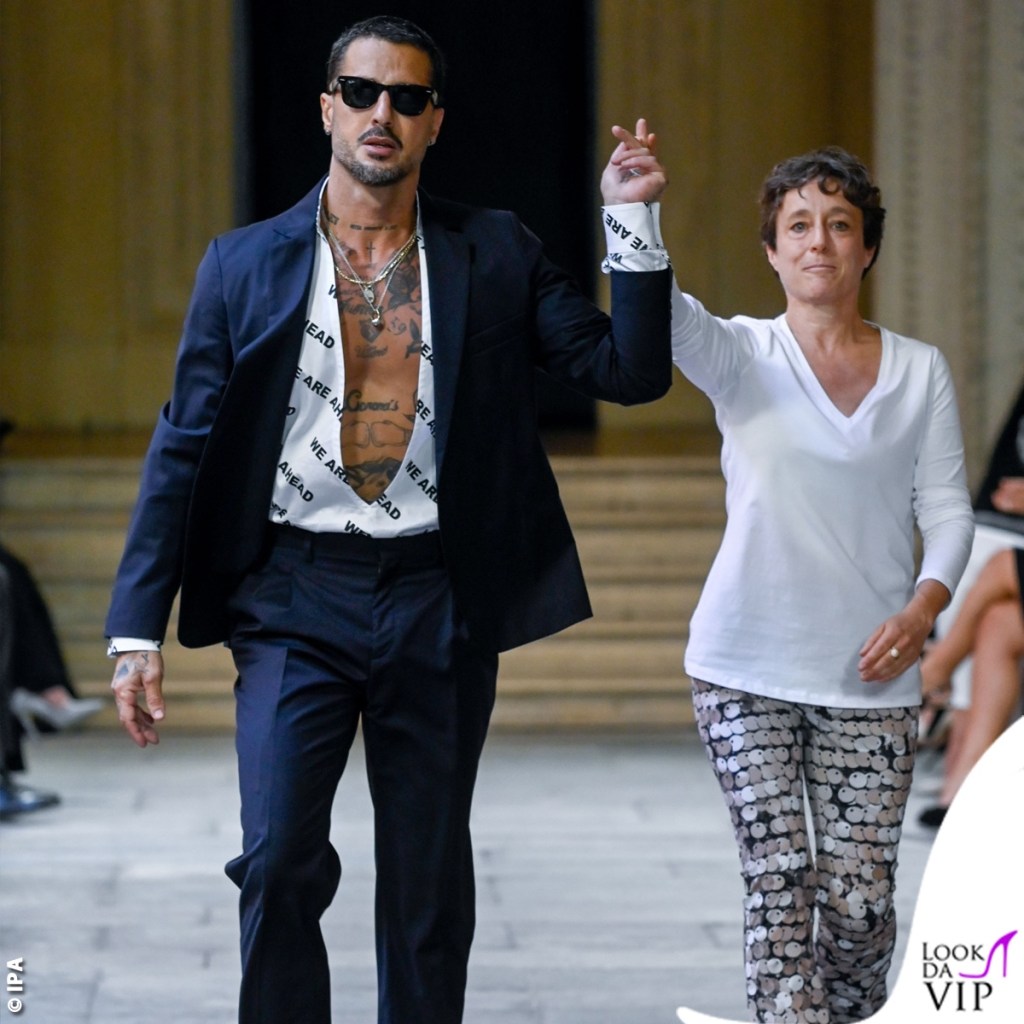 Due i look portati in passerella: un completo blu con giacca sbottonata e un tailleur nero con pantalone a vita alta e blazer crop. Sotto entrambi, una camicia bianca con impresso “We are ahead“, baluardo della sua presenza e punto focale della strategia comunicativa. Ma è nel backstage che Fabrizio Corona ha dato il meglio di sé, raccontando ai giornalisti la sua rabbia.