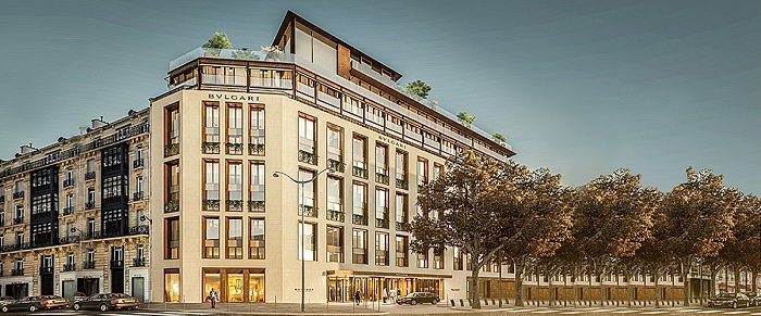 Situato nel cuore del “Triangle d’Or “di Parigi, nell’ottavo arrondissement, l’albergo è stato progettato dallo studio di architettura italiano Antonio Citterio Patricia Viel. L’hotel comprende 76 camere, delle quali il 75% sono suite, dotate di terrazze e logge. Ciascuna è disegnata come un appartamento privato e arredata con mobili di firmati da noti marchi del lusso. Le opere d’arte e le fotografie di celebrities legate alla maison aggiungono una nota che contraddistingue i Bulgari Hotels & Resorts. Situata in cima all’edificio, la Bulgari Penthouse si estende su un totale di oltre 1.000 mq, di cui 400 interni e 600 esterni, distribuiti su due livelli. Quest’attico dispone di un giardino pensile, ricco di piante mediterranee e alberi da frutto, e offre una vista panoramica sugli edifici simbolo della capitale francese. Il ristorante è curato dallo chef tre stelle Michelin Niko Romito, che ha sviluppato un concept dedicato a tutti gli hotel della catena, basato su un connubio tra piatti moderni e classici della cucina italiana.