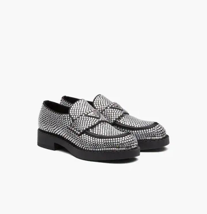I mocassini di Prada puntano invece su dettagli appariscenti e luminosi.