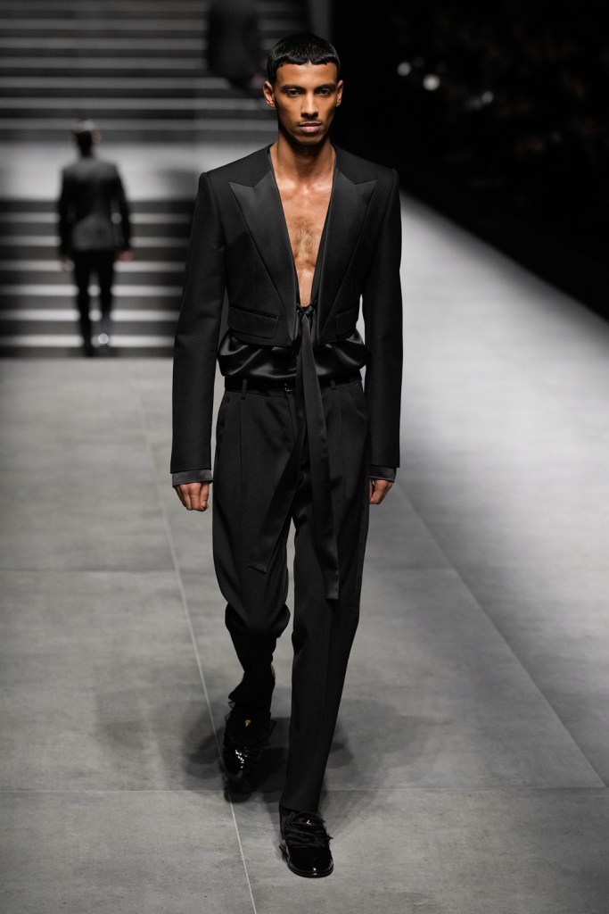 Dall’era della Dolce Vita è nata, così, la figura di un fotografo alla ricerca di momenti esclusivi e irripetibili della vita degli attori, con i divi che vengono immortalati nella loro quotidianità, tra luci della ribalta e frammenti di intimità. Questo affascinante mondo definisce i codici estetici di Dolce e Gabbana e viene posto al centro della nuova collezione, che esplora sia il lato pubblico che quello privato delle icone del cinema materializzando la loro allure nel carattere dell’uomo contemporaneo. I look raccontano lo stile di vita degli attori, dall’alba al tramonto, dal comfort del tempo libero all’eleganza del red carpet. La sfilata diventa così l’evento perfetto per celebrare il mood “effortless”, senza sforzo, di una quotidianità definita anche dal layering, il modo di vestire a strati a seconda del tempo e delle proprie esigenze. Uno stile contemporaneo e in evoluzione ma sempre all’insegna dell’eleganza e della ricercatezza più assoluta, da riservare anche alle occasioni speciali. Menzione speciale per le spille apposte sui baveri, sui revers, sulle camicie: preziose e scintillanti, sono ispirate allo stile degli anni Quaranta.