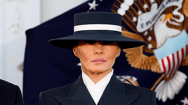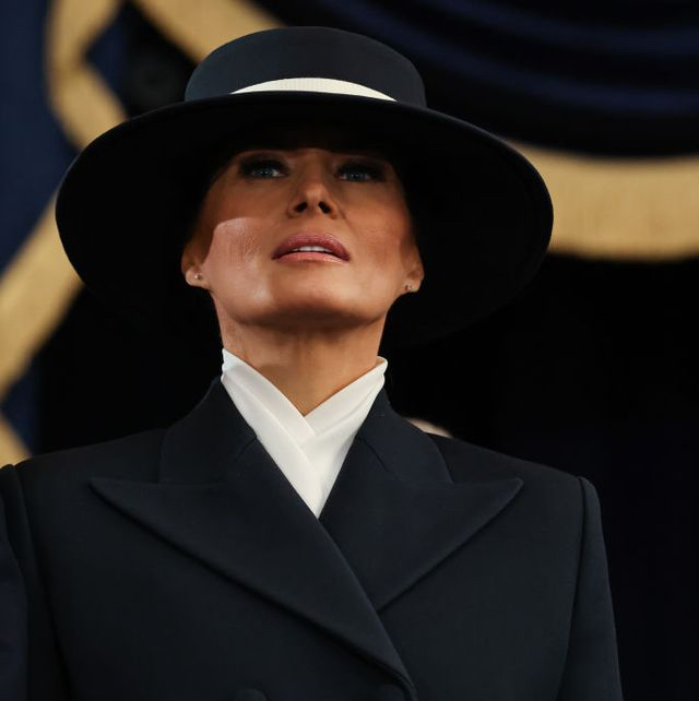 Tuttavia, l’accessorio che ha catturato maggiormente l’attenzione è stato il cappello blu navy, abbinato al suo cappotto su misura, arricchito da una fascia bianca che richiamava il colletto della giacca. Perché Melania avrebbe scelto un copricapo così importante, quasi coprente, per una cerimonia dove sarebbe stata tra i protagonisti? Forse l’intento di Melania era di restare in secondo piano, di schermare il suo sguardo e creare una distanza tra sé e gli altri, come se il cappello fungesse da barriera, un’alternativa ai classici occhiali da sole che in tale contesto sarebbero stati inappropriati. O forse voleva comunicare un messaggio sul suo approccio come First Lady durante il secondo mandato del marito, ovvero esporsi il meno possibile.